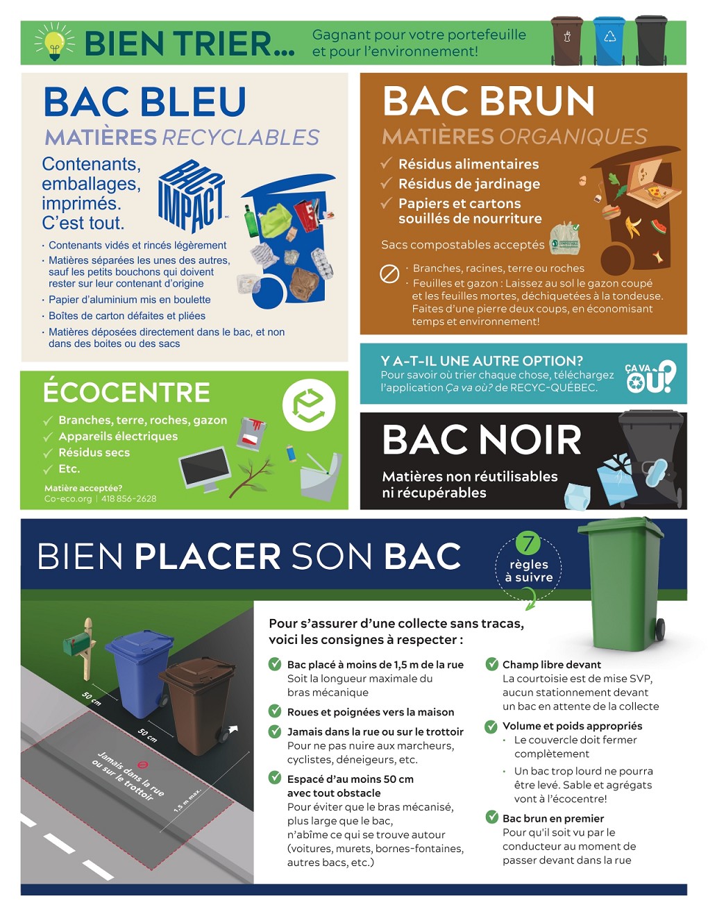 Placez vos bacs dans votre entrée de stationnement, jamais sur le trottoir ni dans la rue. Gardez-les accessibles et éloignés des obstacles.